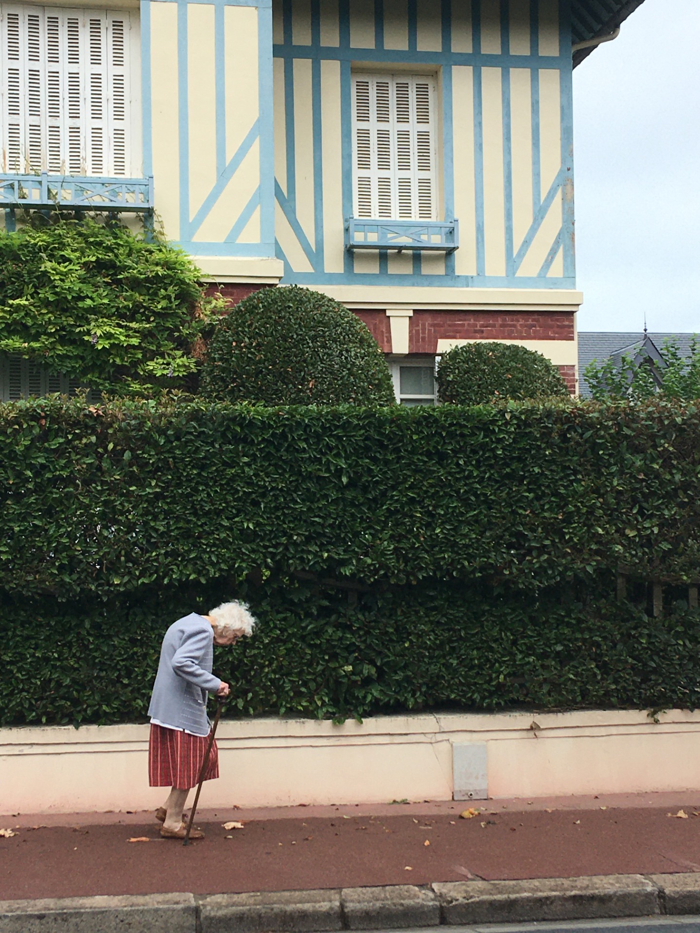 Aan de voet van de 'Roches Noires', op ooghoogte met de horizon, zit nu een bejaarde dame in een stoeltje. Alles aan haar is roze: haar kleed, haar hoed, haar schoenen. Ze haakt, ze haakt aan de tijd, ze haakt in de tijd. Dit kleine hoekje van Trouville lijkt op het einde van een wereld, het voelt als een stukje 'Finistère' waar die tijd, een datum, een dag ophouden te bestaan. Over zee begint het te regenen.