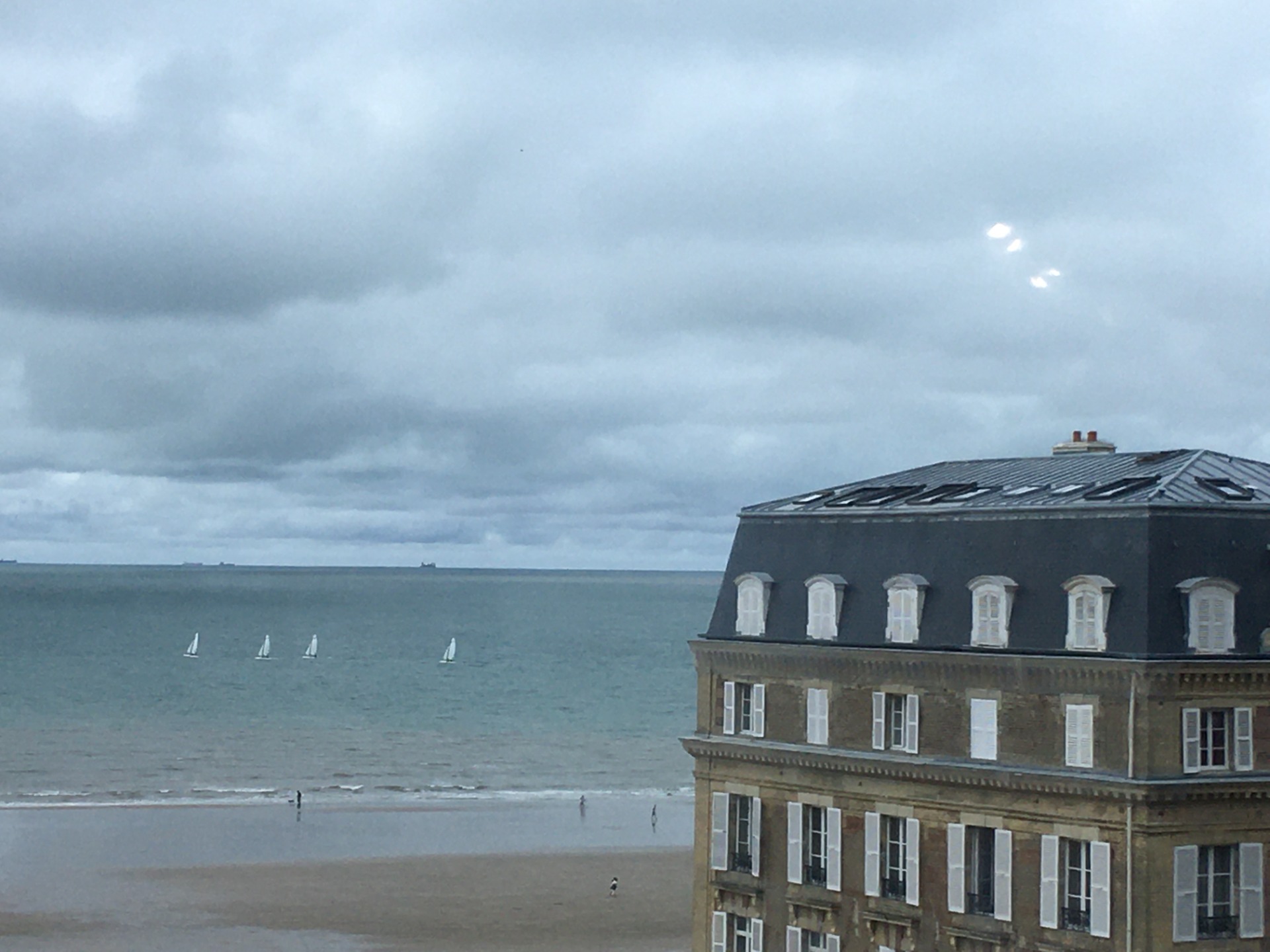 Het mooiste schilderij zie ik vanuit het raam, hier en nu. Rechts 'Les Roches noires', links het malse strand met daarvoor het blauwe uitgestrekte water. Wattige wolken. Schuimvlokken. Golven als glijdende rimpels. Zeilbootjes. Stipjes wandelaars. Meeuwen. Plassen als grillige spiegels in het zand.